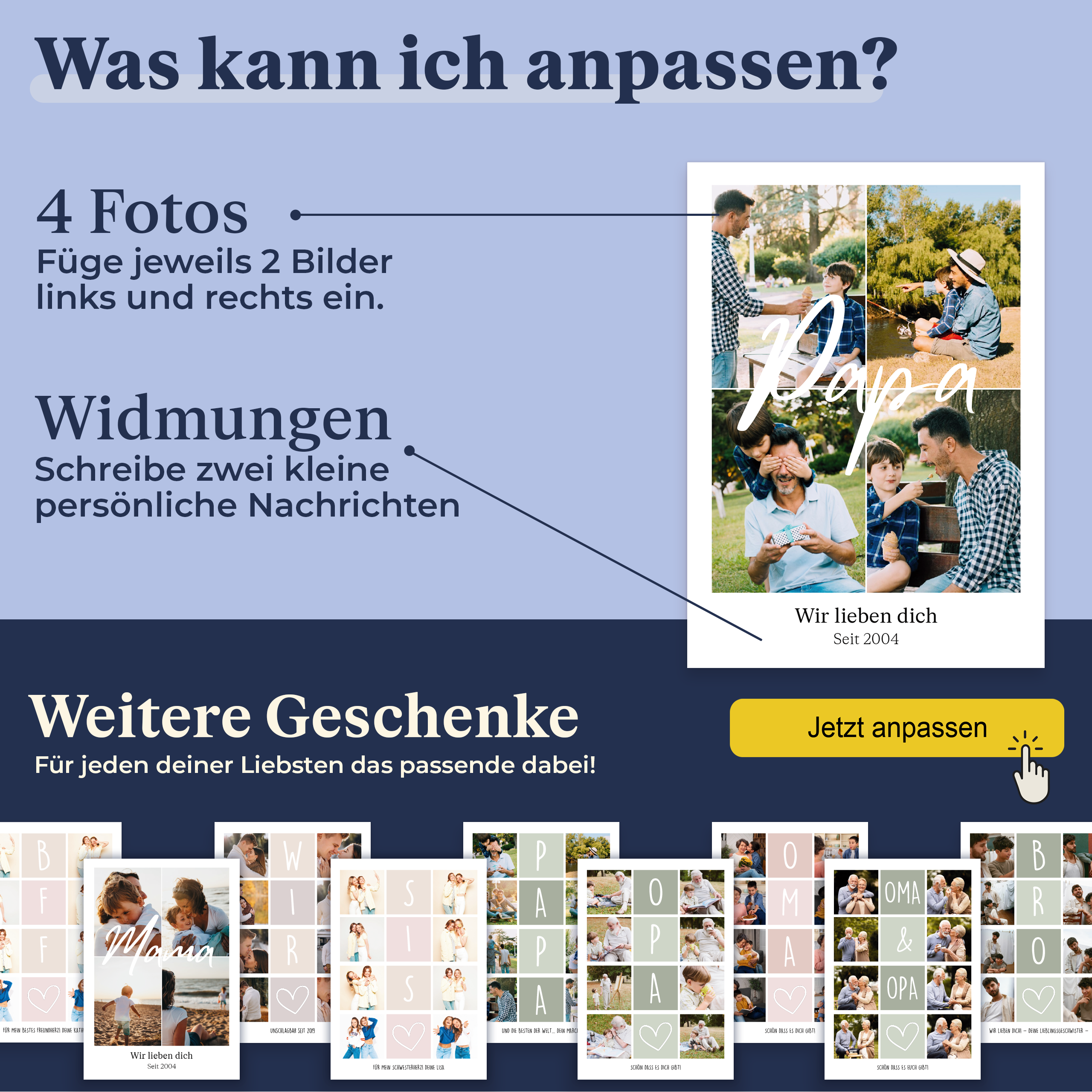 • PERSONALISIERTE FOTO COLLAGE – Die Collage besteht aus bis zu 4 persönlichen Fotos, die witzig, rührend oder legendär sein können – ergänzt durch eine individuelle Botschaft. Ein echtes Foto Geschenk mit Bedeutung. Eines der beliebtesten Fotogeschenke personalisiert, ideal für Väter mit Herz.