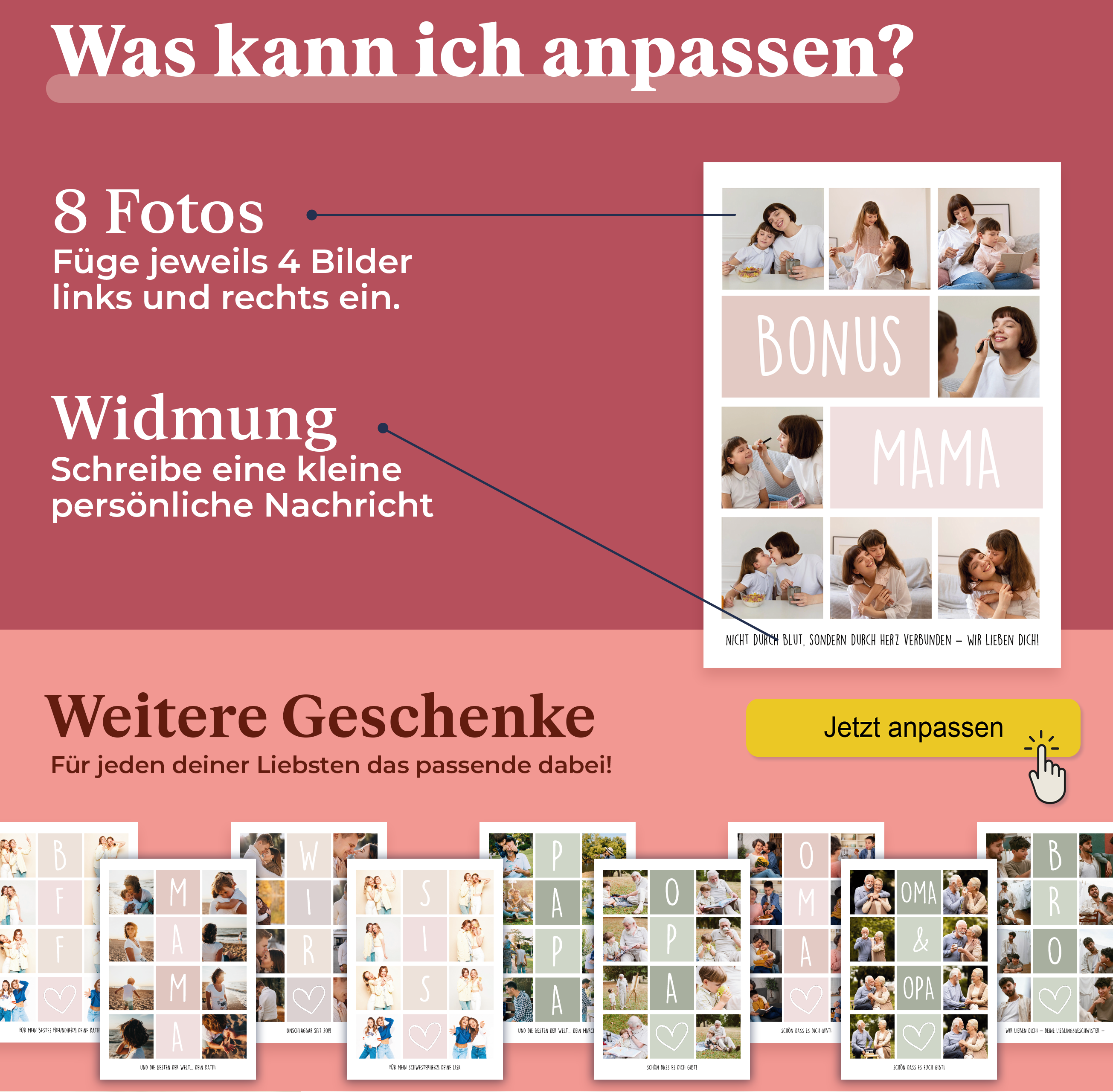 • PERSONALISIERTE FOTO COLLAGE — Die Collage besteht aus bis zu 8 persönlichen Fotos, die herzlich, witzig oder voller Erinnerungen sind – ergänzt durch eine persönliche Botschaft. Ein echtes Foto Geschenk mit Bedeutung. Eines der beliebtesten Fotogeschenke personalisiert für Bonus Mamas