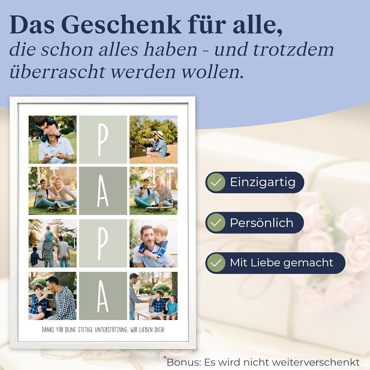 • PERSONALISIERTE GESCHENKE — Dieses PAPA Bild verwandelt wertvolle Erinnerungen in eine maßgeschneiderte Fotocollage, ideal als Vatertagsgeschenk oder Geschenk für Papa. Diese Fotocollage ist eine ausgezeichnete Wahl als Geschenk für Männer, das dauerhafte Erinnerungen schafft und besondere Momente stilvoll zelebriert
