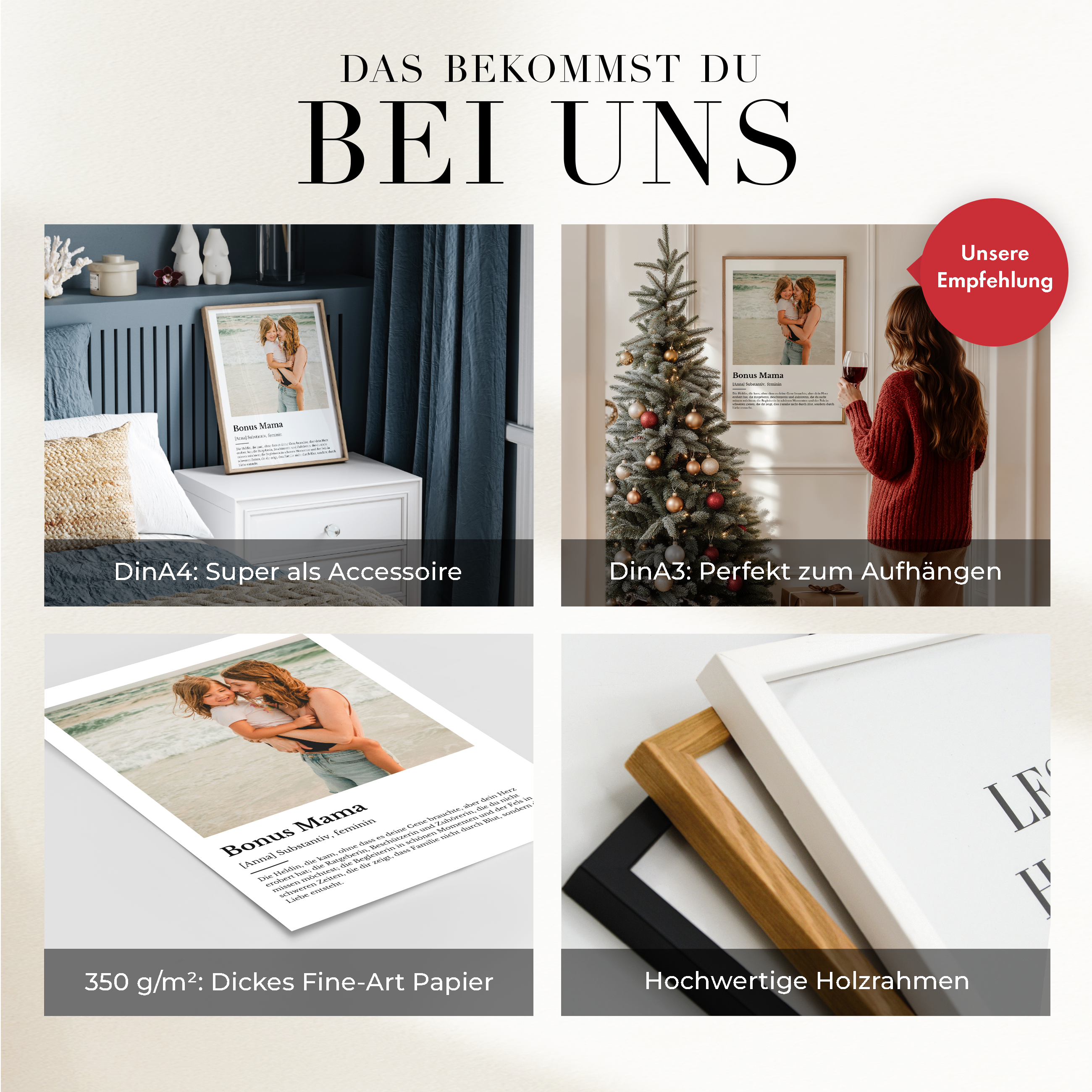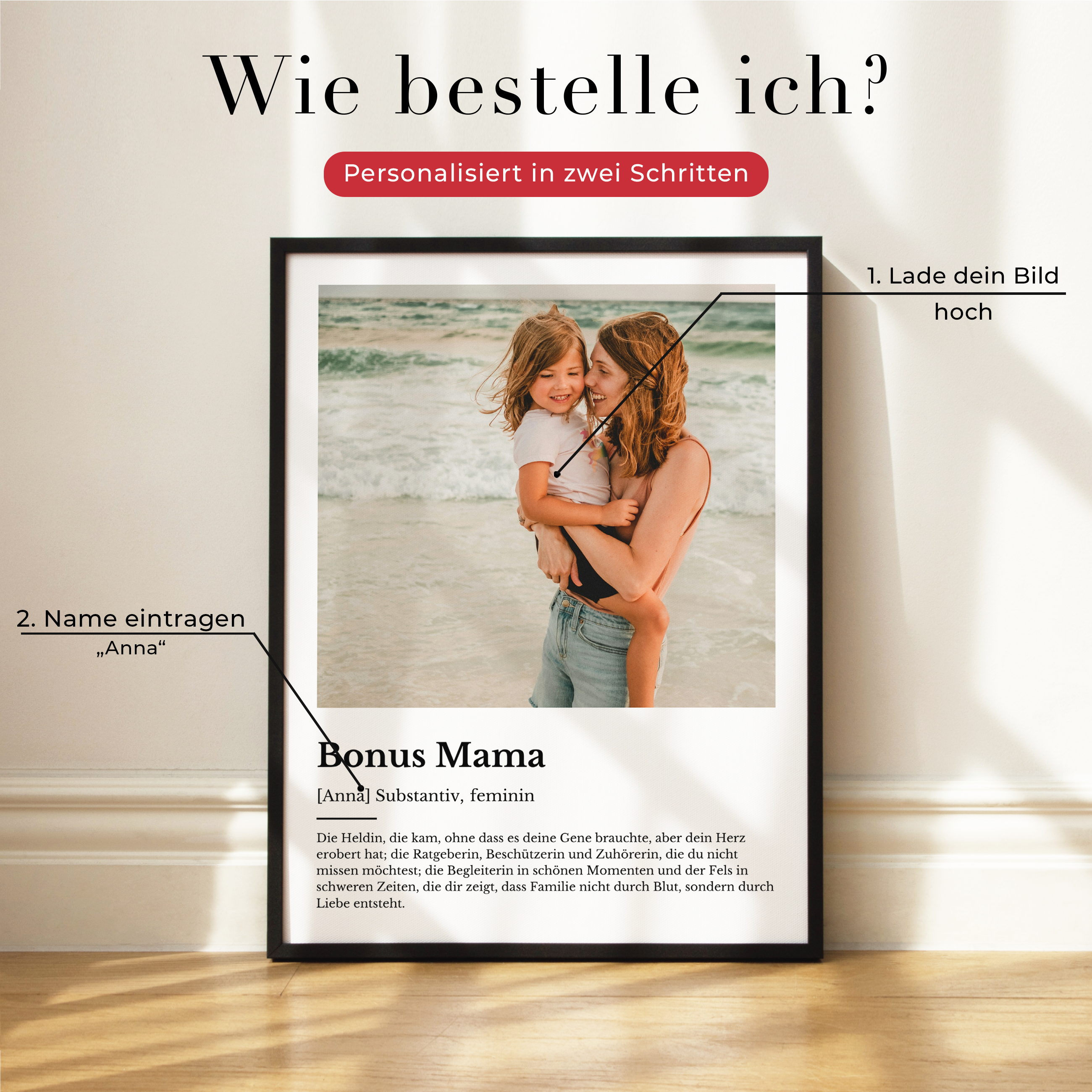 • Einfach & Unvergesslich — Kein Stress mit einem Fotoalbum: Lade einfach ein Bild hoch, und wir verwandeln es in ein hochwertiges Wandbild. Dieses personalisierte Muttertag Geschenk für deine Bonus Mama bleibt für immer in Erinnerung und zeigt, wie besonders eure Verbindung ist