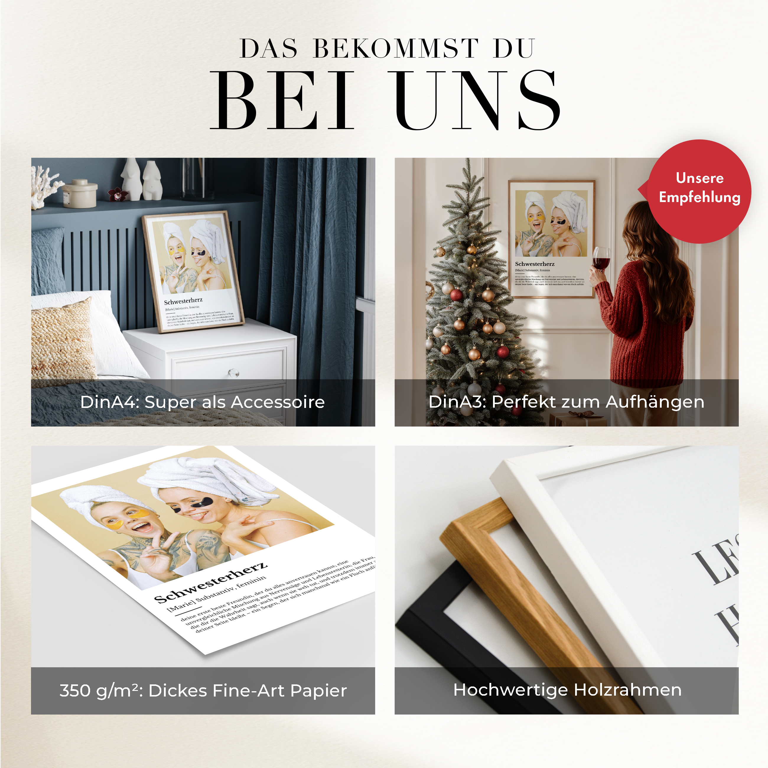 • Einfach & Unvergesslich — Kein Stress mit einem Fotoalbum: Lade einfach ein Bild hoch, und wir verwandeln es in ein hochwertiges Wandbild. Dieses personalisierte Geschenk für deine Schwesterherz bleibt für immer in Erinnerung und unterstreicht eure besondere Verbindung