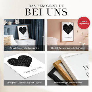 Unsere Designs sind modern, clean und gleichzeitig warm und einladend – perfekt, um deinem Zuhause Charakter zu geben oder jemandem ein einzigartiges Geschenk zu machen. Ob für Hochzeiten, Geburtstage oder einfach als kleines „Danke“ zwischendurch: Unsere Prints berühren Herzen und bleiben unvergesslich.
