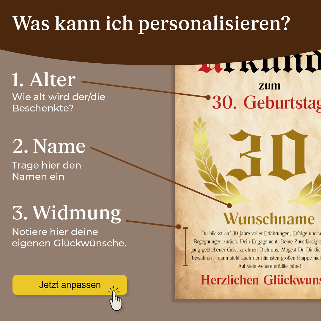 • Einfach auf „Jetzt anpassen“ klicken – Geben Sie Name und Geburtsjahr ein, um Ihre ganz persönliche Urkunde zu gestalten. Das perfekte, individuelle Geschenk für Frauen & Männer. Wir liefern ein liebevoll gestaltetes Erinnerungsstück direkt zu Ihrer Wunschperson