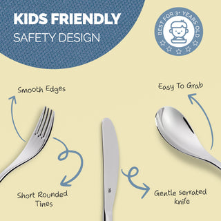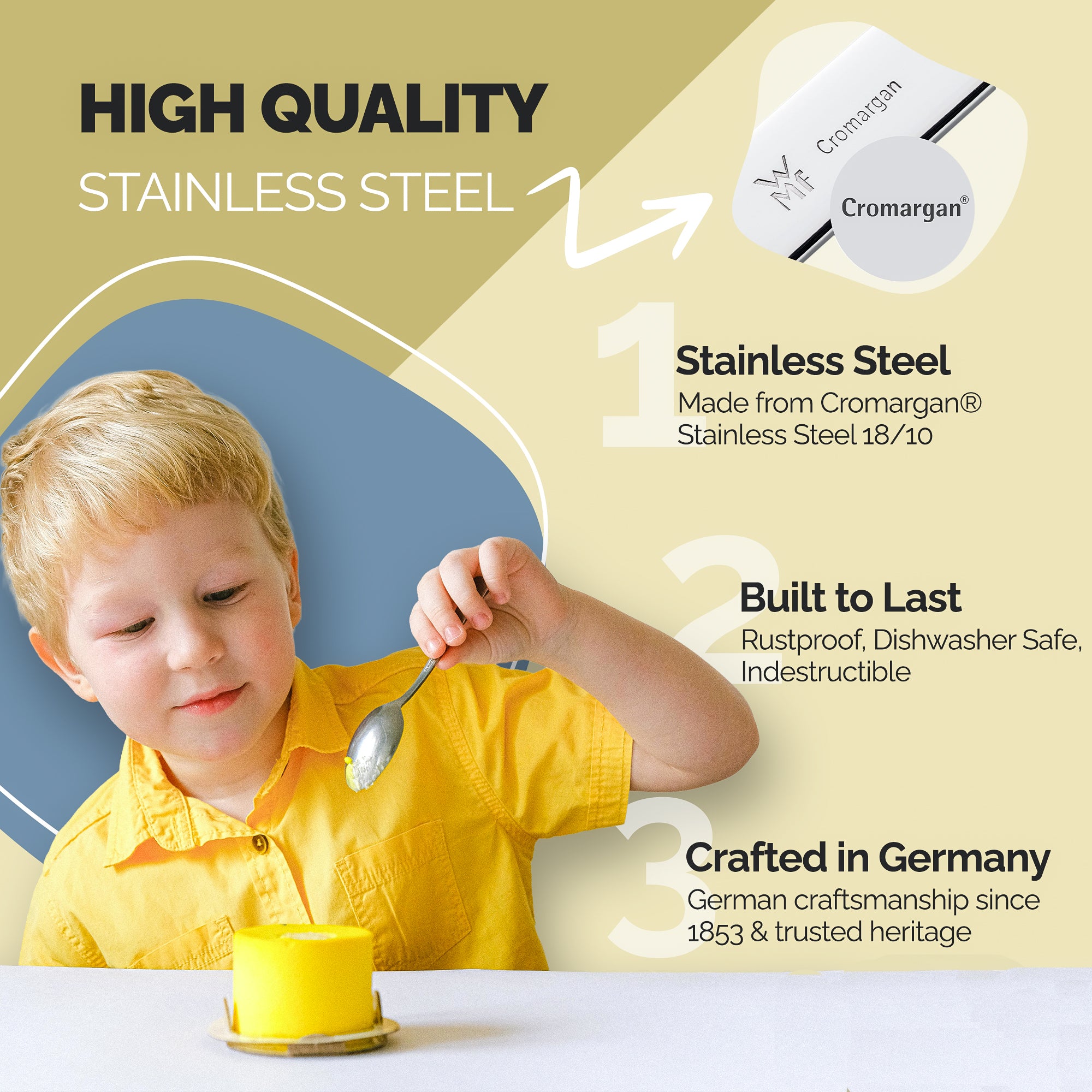• Gemacht für den Alltag — Das robuste WMF Kinderbesteck aus Edelstahl ist rostfrei, spülmaschinenfest und langlebig – das ideale Essbesteck für jede Mahlzeit vom Frühstück bis zum Abendbrot